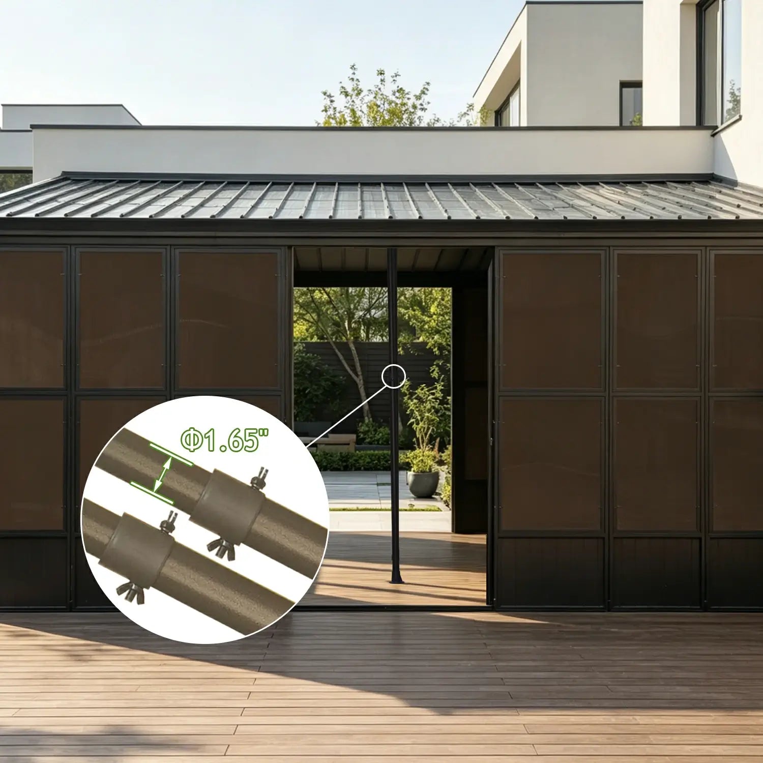 Engineered for maximum stability, our 1.65" pro-duty support beam provides the ultimate defense against heavy snow loads and high winds. While standard enclosures may sag or wobble, this thickened, powder-coated aluminum column reinforces your roof frame for superior structural integrity and year-round safety. Its high-capacity design and precision locking hardware ensure your sanctuary remains rock-solid and secure through every season—offering professional-grade strength that flimsy competitors simply can't match.