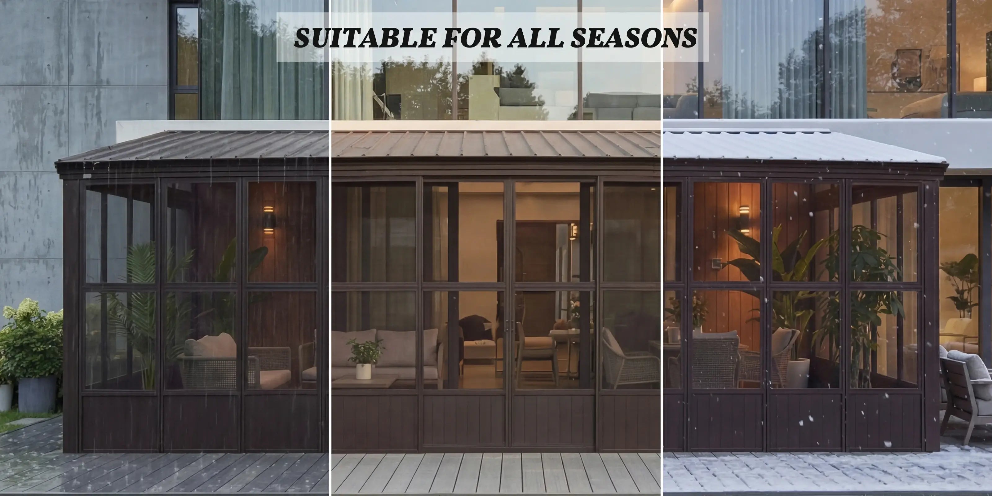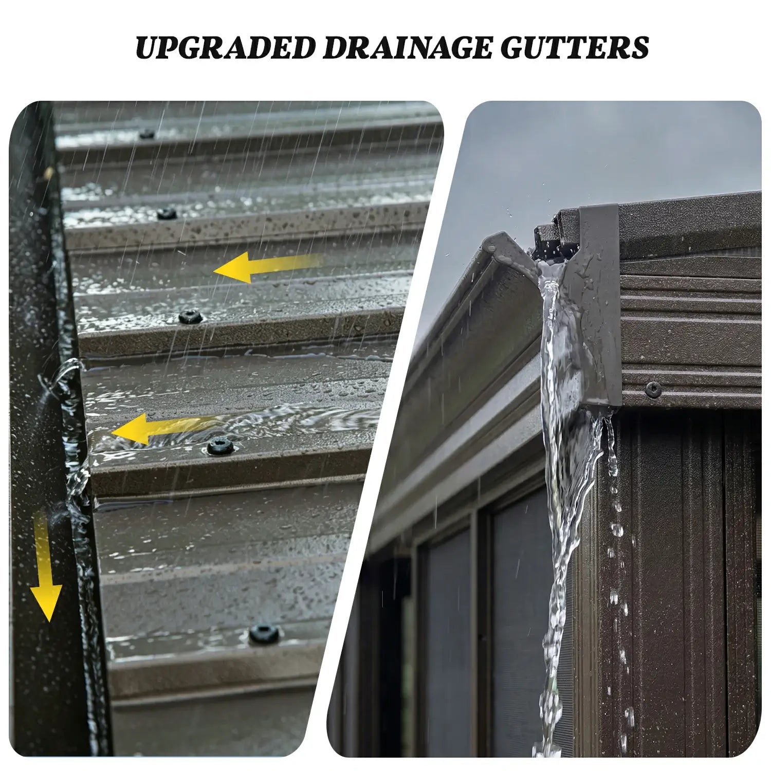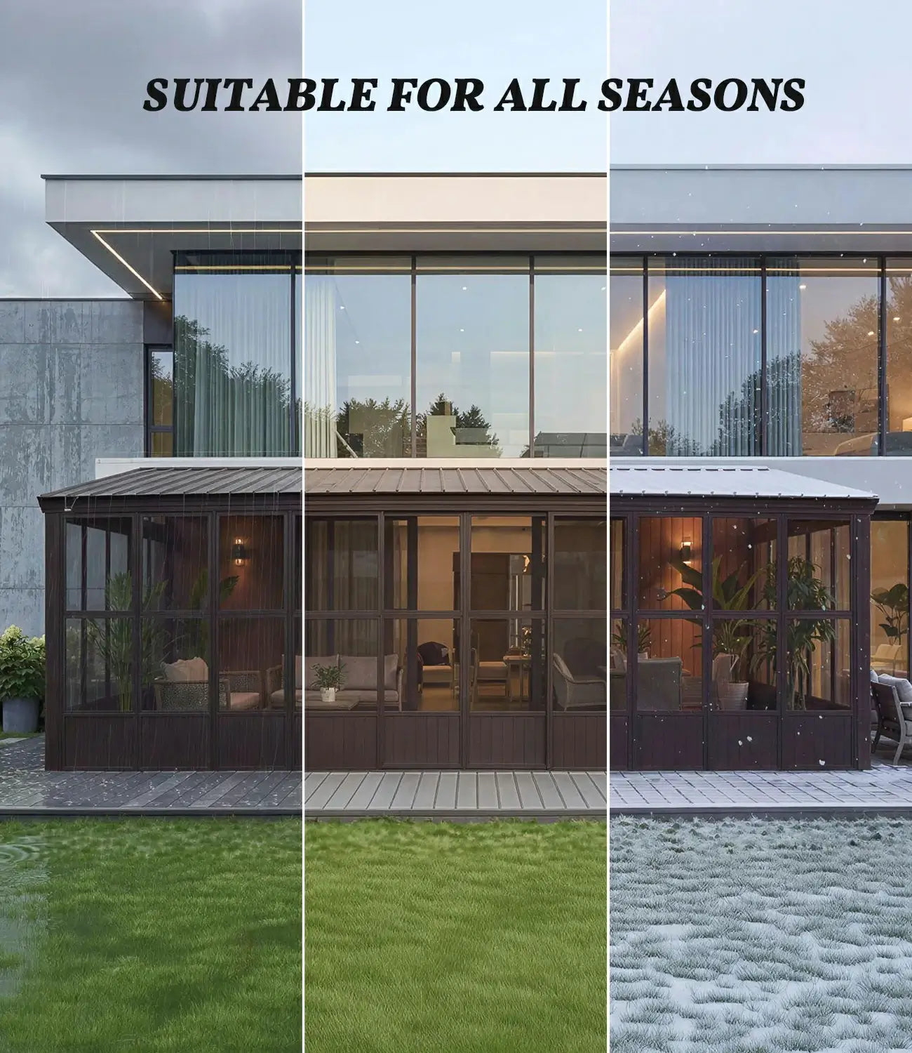 Unlike standard enclosures that cause messy water overflow, our sunroom features an upgraded, high-capacity gutter system engineered for heaviest rain and snowmelt. This exclusive design instantly captures and redirects water away from your entrance and home foundation, eliminating the "water curtain" effect and preventing costly moisture damage. Built with weather-hardened aluminum to withstand extreme freeze-thaw cycles, it ensures a bone-dry, premium retreat where competitors simply fail to perform.