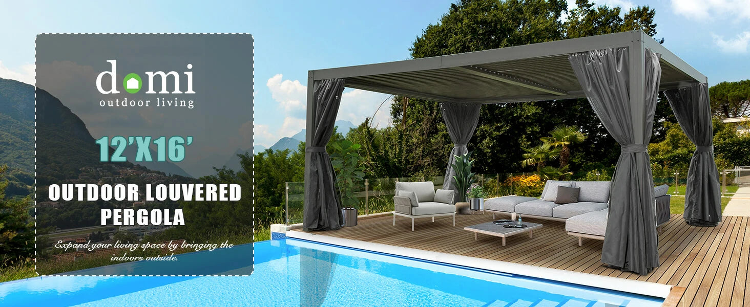 Its sleek and modern design seamlessly blends with any architectural style, allowing you to create a harmonious and visually striking environment. Personalize your pergola with string lights, hanging plants, or elegant draperies to enhance the ambiance and create an atmosphere that reflects your unique sense of style. The Domi louvered pergola is your canvas, waiting to be transformed into a masterpiece.