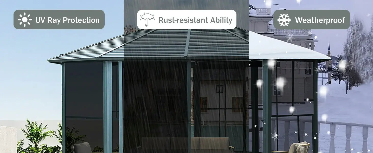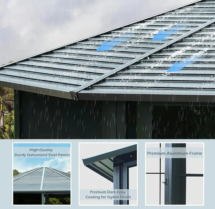 The galvanized steel roof provides superior strength and durability, ensuring that your gazebo will withstand even the harshest weather conditions. The aluminum frame is lightweight yet sturdy, guaranteeing both stability and ease of assembly. This remarkable gazebo offers unbeatable protection against the elements, allowing you to enjoy your outdoor space year-round.