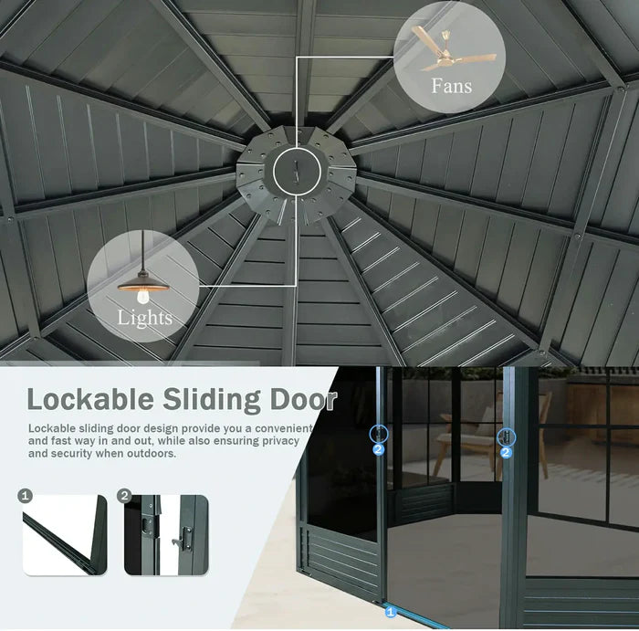 Embrace seamless indoor-outdoor living with our Domi garden house's convenient lockable sliding door. There is a hook at the top, which allows for the installation of a fan or light according to your needs, enhancing the comfort of your outdoor experience.