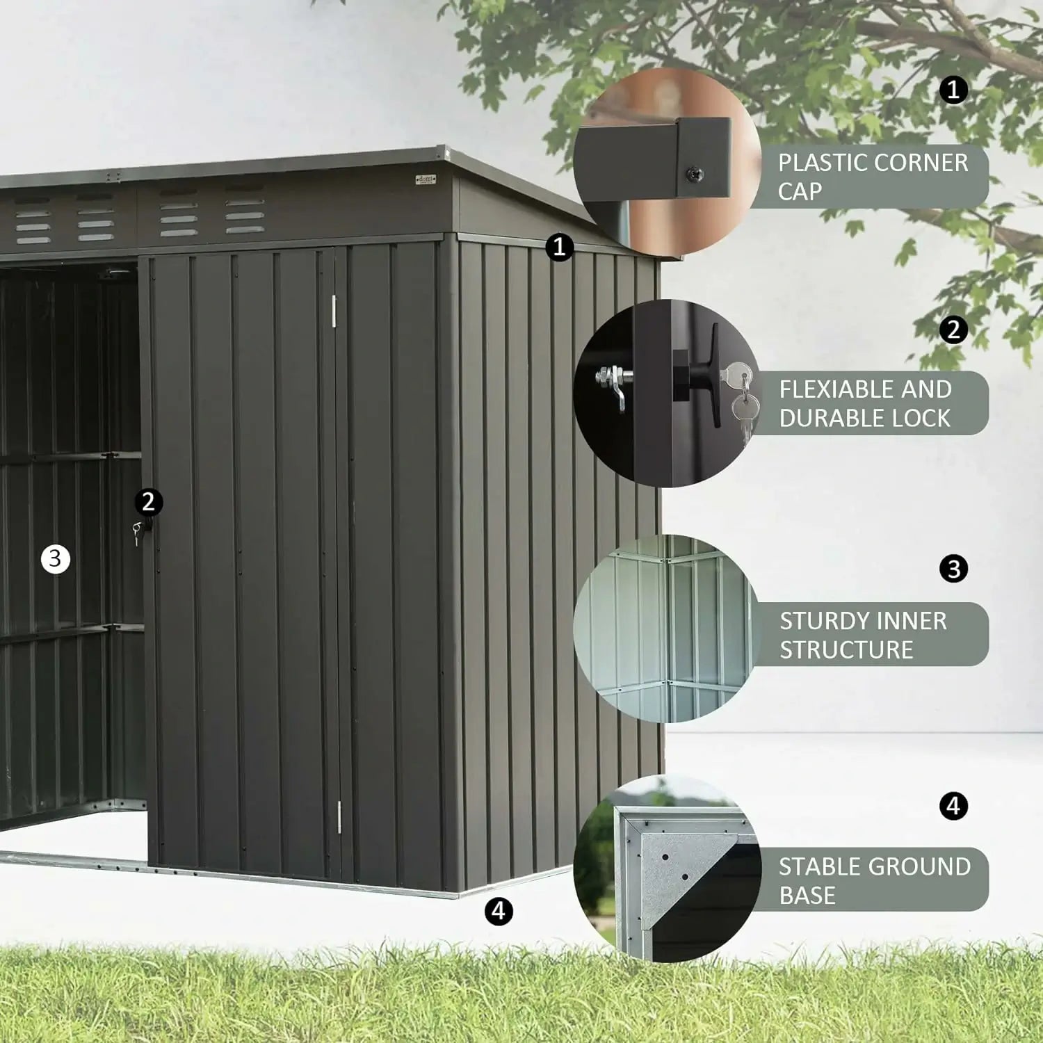 The outdoor metal tool shed helps hide your yard waste and large equipment, avoid clutter in your yard, basement, or garage. The garden storage shed adds a crisp clean appearance that blends perfectly with any exterior design or landscaping.