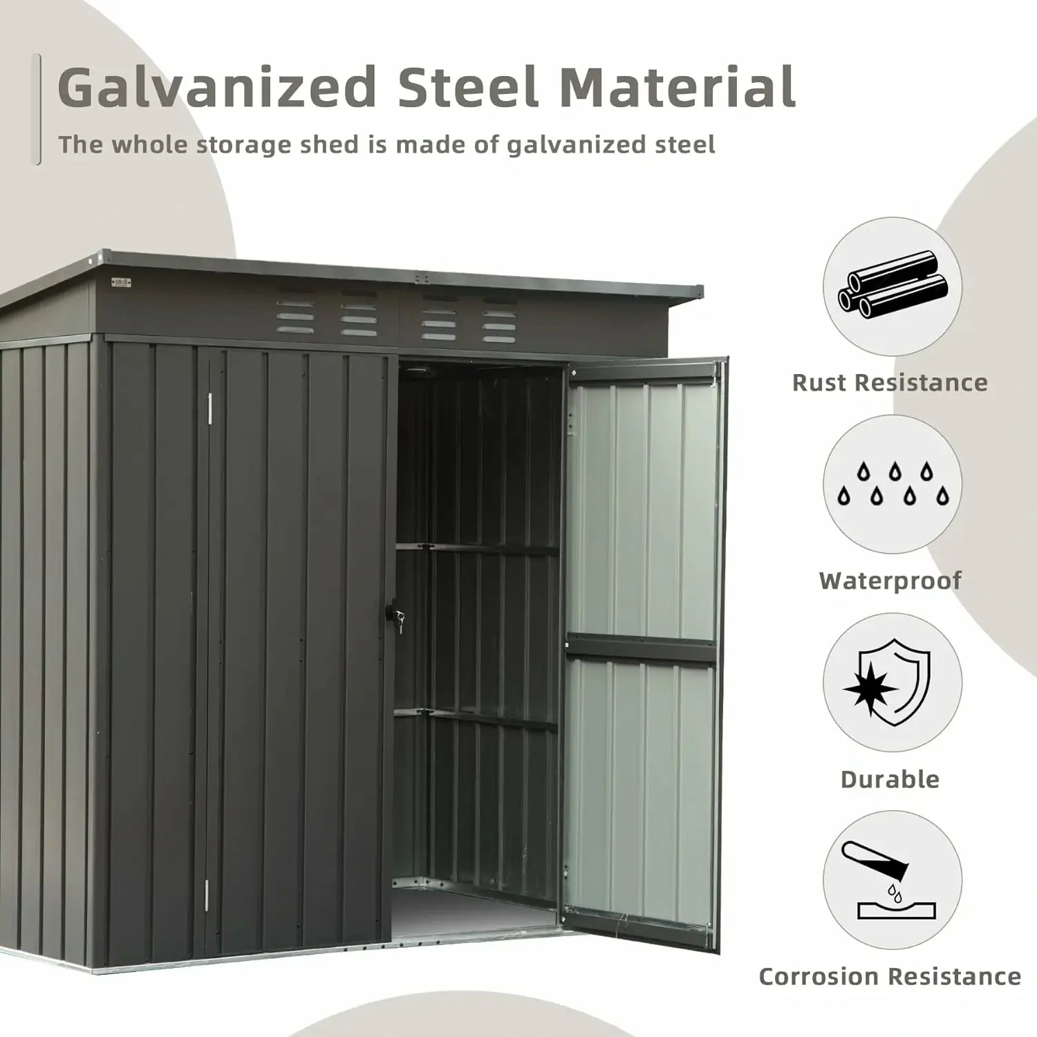The outdoor storage box equipped with vents to increases lighting and airflow; UV protective galvanized steel will help to keep the sheds & outdoor storage clearance in all weather-resistant.