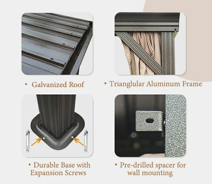 Crafted with a robust and durable aluminum frame, this gazebo offers exceptional strength and stability. Featuring pre-drilled holes in the back for fixing to the wall, it offers exceptional strength and stability. With its unique design, the Domi Outdoor Living Wall Mounted Hardtop Gazebo offers a reliable shelter, protecting you and your loved ones from the elements.