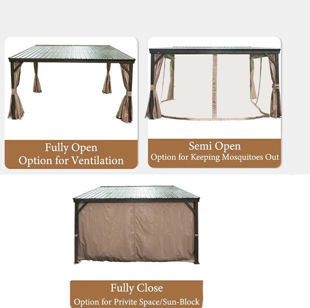 The gazebo comes equipped with curtains and netting, allowing you to customize your space based on your preferences. Draw the curtains for privacy and shade during the day, or let them flow gently in the breeze for an elegant touch. The netting keeps pesky insects at bay, ensuring a peaceful and enjoyable experience outdoors. Whether you're hosting a barbecue, enjoying a family gathering, or indulging in some personal relaxation time, this gazebo sets the perfect stage for memorable moments.