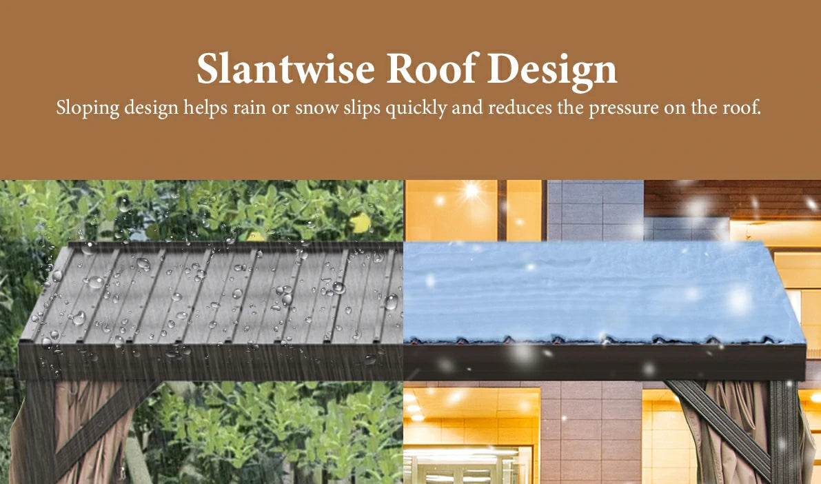 The Lean-to Gazebo features a sloping galvanized steel roof that not only enhances the visual appeal but also ensures efficient water drainage. Gutters are designed at the front of the roof to collect rainwater to run down the posts. The modern design blends seamlessly with any outdoor aesthetic, adding an element of sophistication to your space.